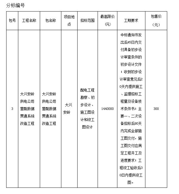 1.国网黑龙江省电力有限公司(以下简称“招标人”)委托国网黑龙江招标有限公司(以下简称“招标代理机构”),采用公开招标方式邀请有兴趣的合格投标人(以下简称“投标人”)就国网黑龙江省电力有限公司2014年大兴安岭供电公司营配数据贯通系统改造项目工程勘察设计招标文件提交密封的有竞争性的投标文件。详细内容参见附件“需求一览表”。
