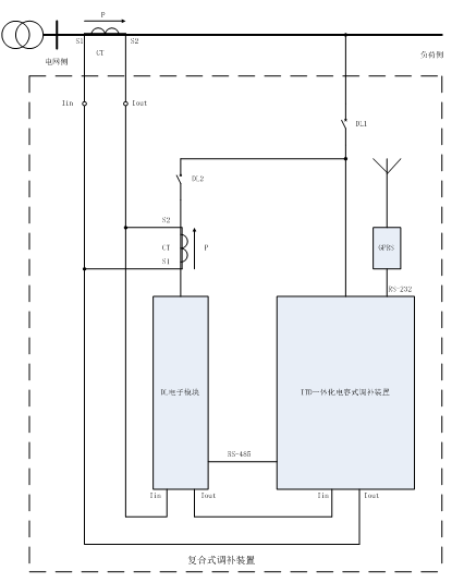 复合式调补装置是我公司为满足配电网运行需求,自主研发的一种电能质量优化装置。它采用了DL型CSVG模块的ITD型电容式调补装置模块相融合的技术方式,充分发挥的两者的长处,实现了大容量动态优化电能质量功能。其原理是由电容式调补装置对变化负荷的基础量进行有级差跟踪调补,再由CSVG电子模块对剩余的变化量进行动态调补,同时滤除3、5、7、11、13次谐波,在装置调补能力范围内可稳定实现电源侧三相电流平衡,具有功耗低、噪音小、响应快、可靠性高、体积小的优点。
