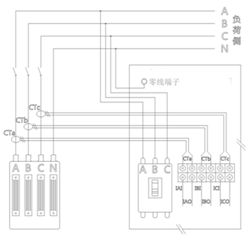 电源电缆接在柜内断路器(NF0)一次侧,一般从左至右为:A(黄)、B(绿)、C(红),零线(黑)接在柜内的零线端子上并紧固。三个互感器的接线按相序A、B、C分别接在互感器接线端子(DZ1)的IAI(s1)—IAO(s2)、IBI(s1)—IBO(s2)、ICI(s1)—ICO(s2) 。