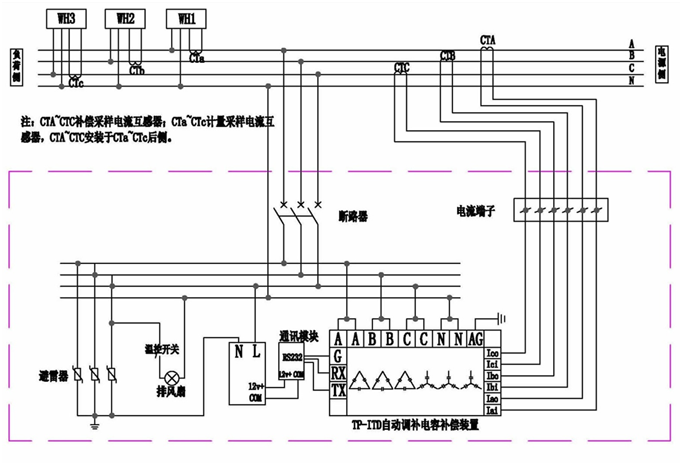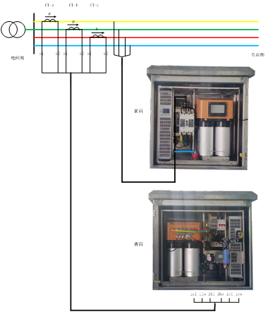 6、将三只电流互感器穿接在补偿点前(电源侧),CT的安装方向(箭头→)由电源侧指向负荷侧P1进P2出;